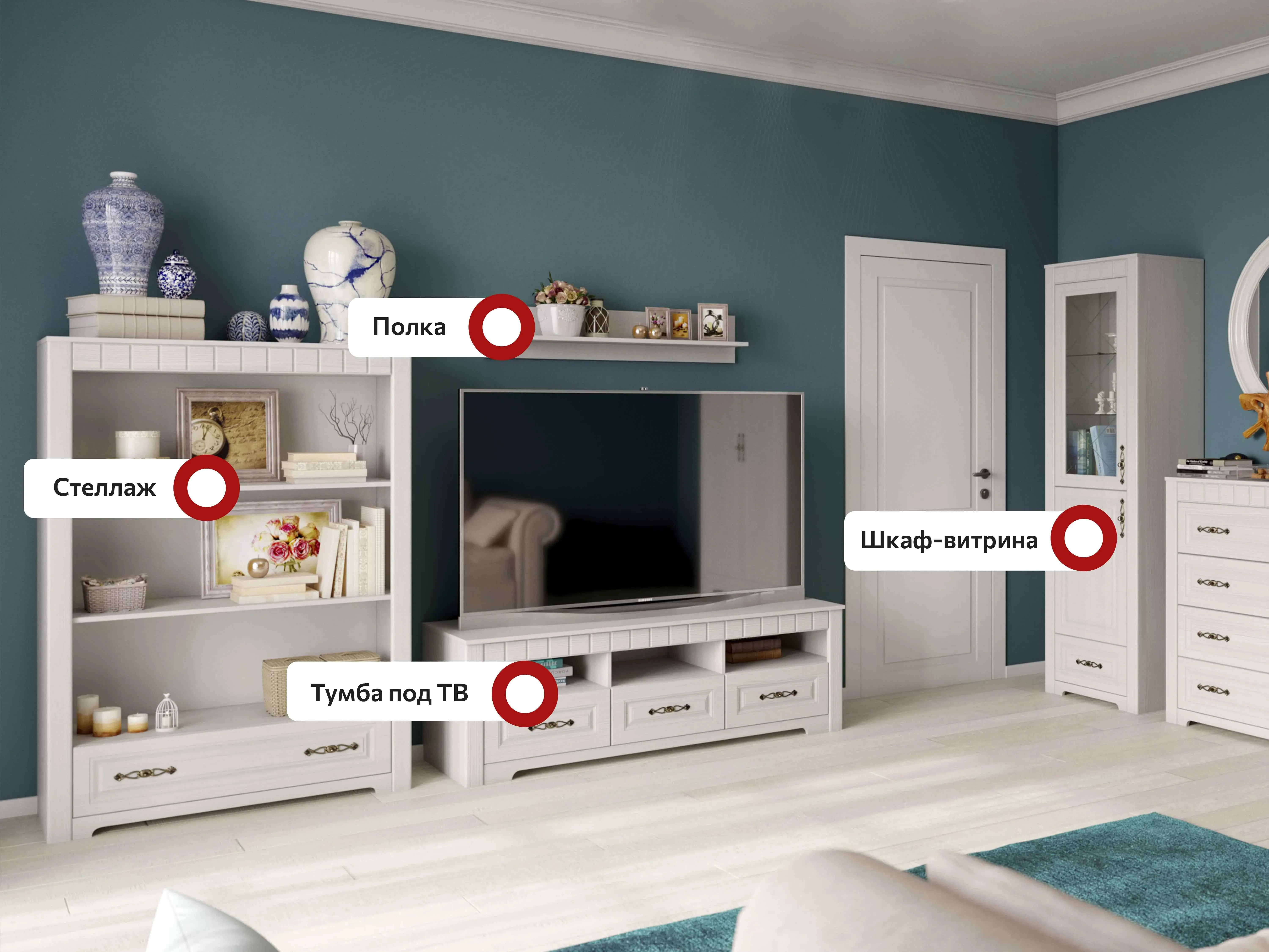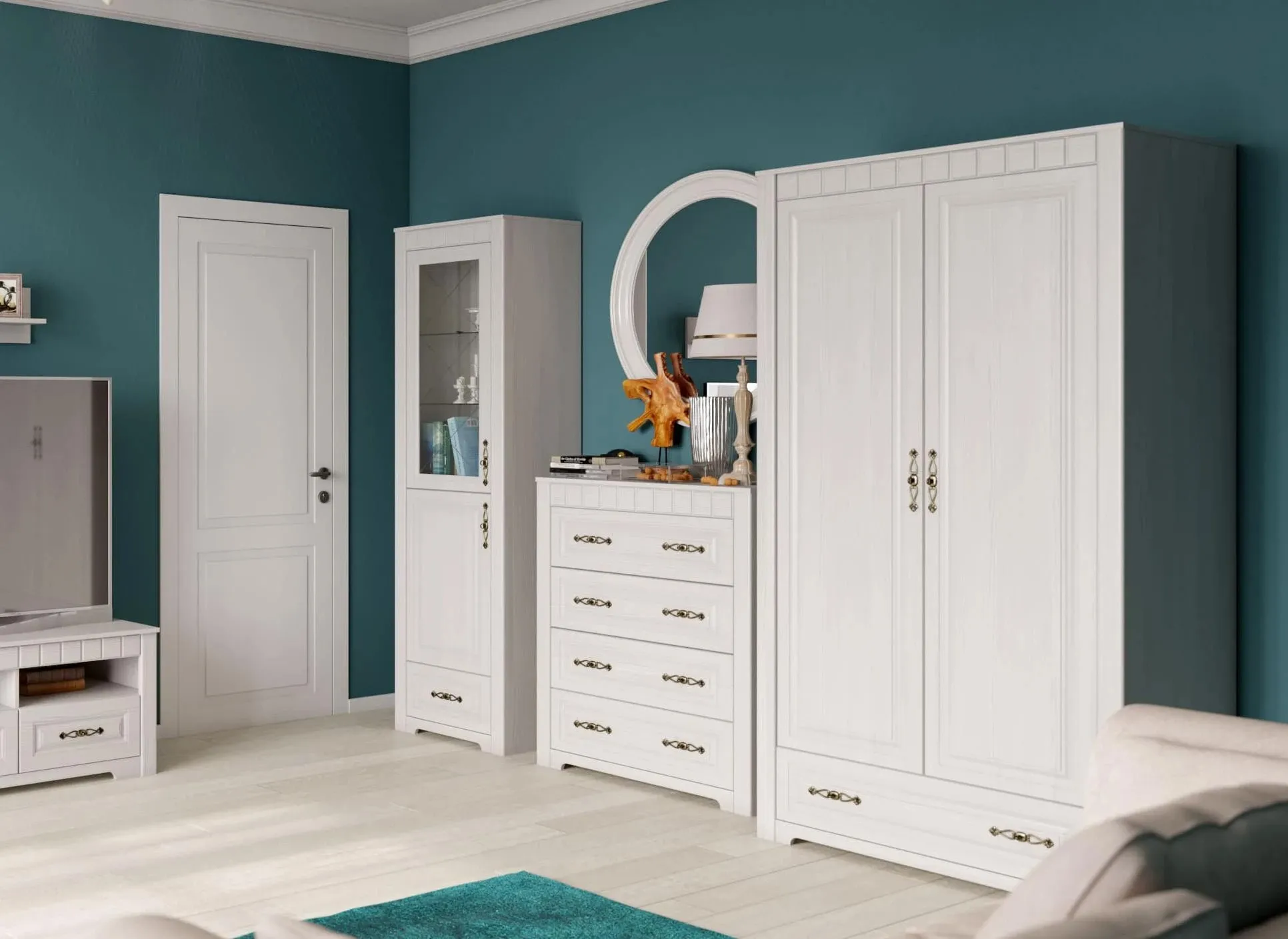 В серию "Прованс" входят: шкаф двухдверный, шкаф-витрина, стеллаж, комод, тумба ТВ, полка навесная.