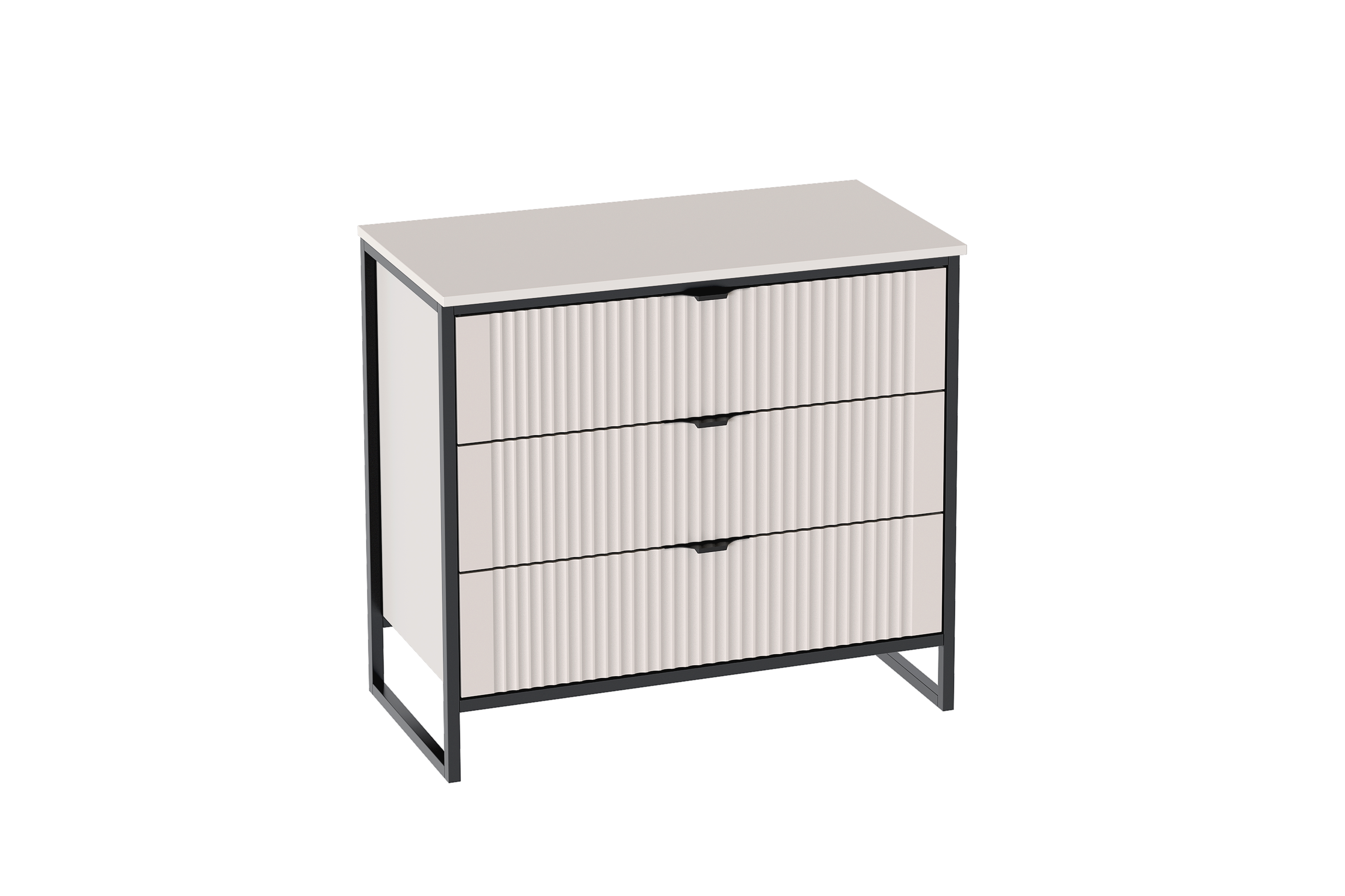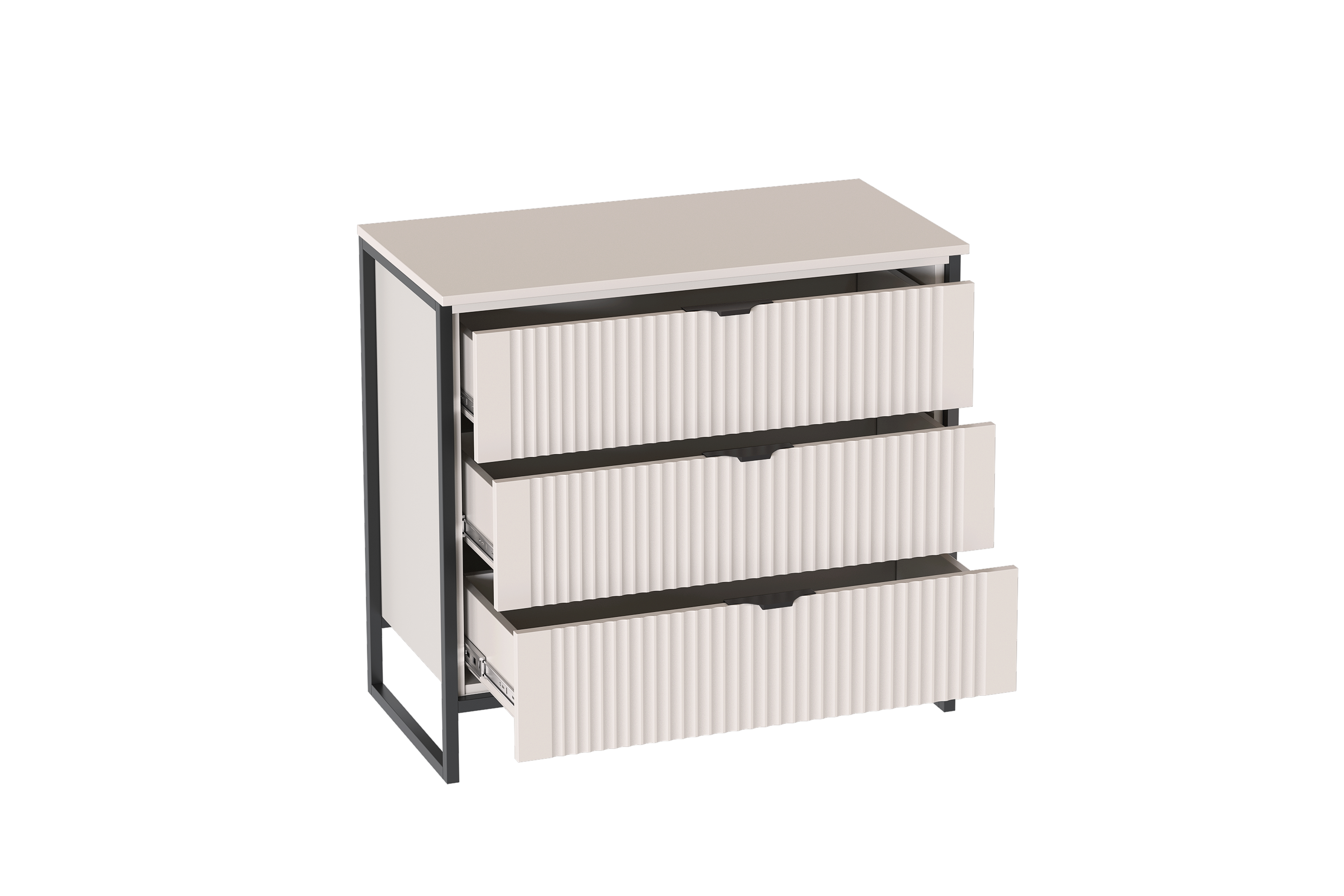 Комод "Нора" на металлокаркасе состоит из трех выдвижных ящиков на шариковых направляющих, что позволяет удобно хранить вещи и поддерживать порядок в комнате. Он выполнен из безопасных, качественных материалов (лдсп и мдф), что гарантирует долговечность и сохранение первоначального вида на протяжении долгого времени.