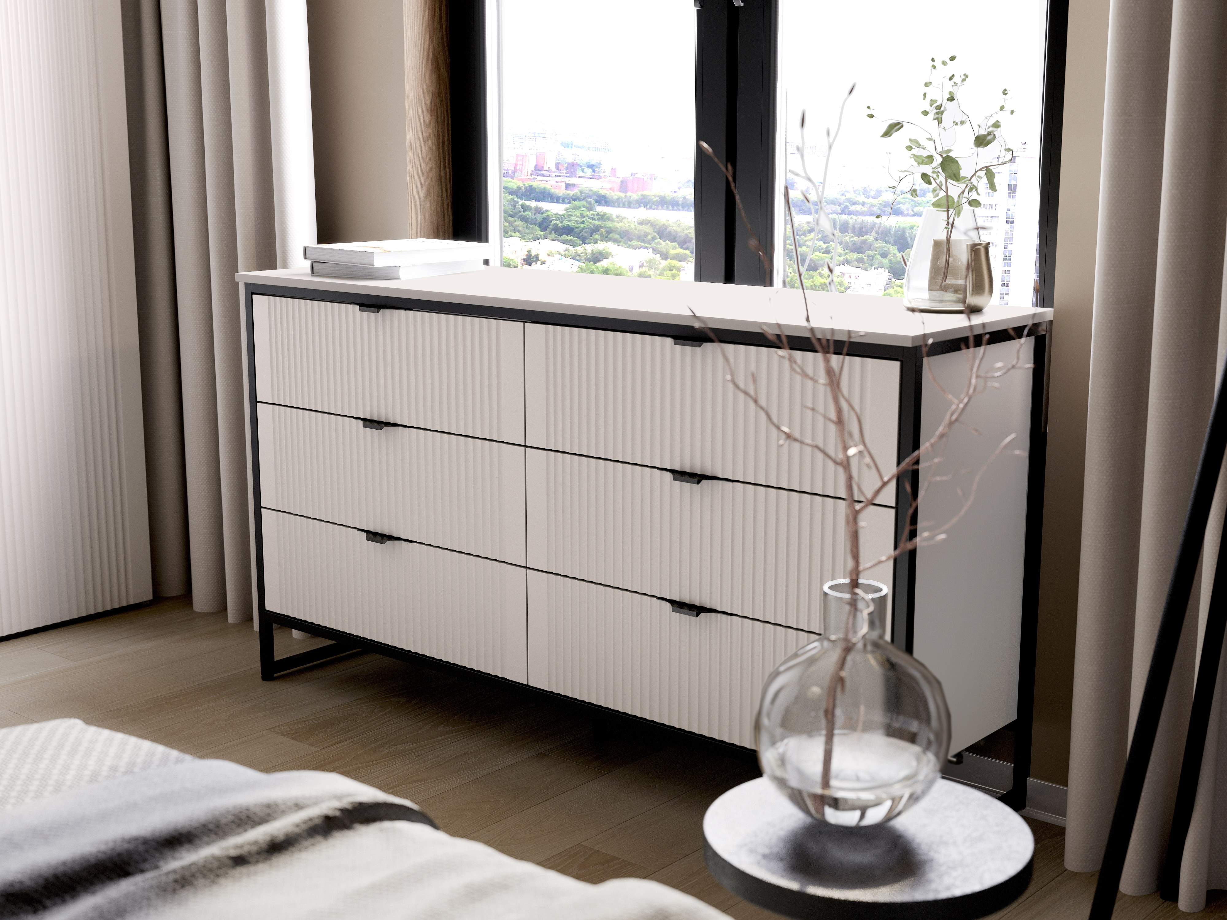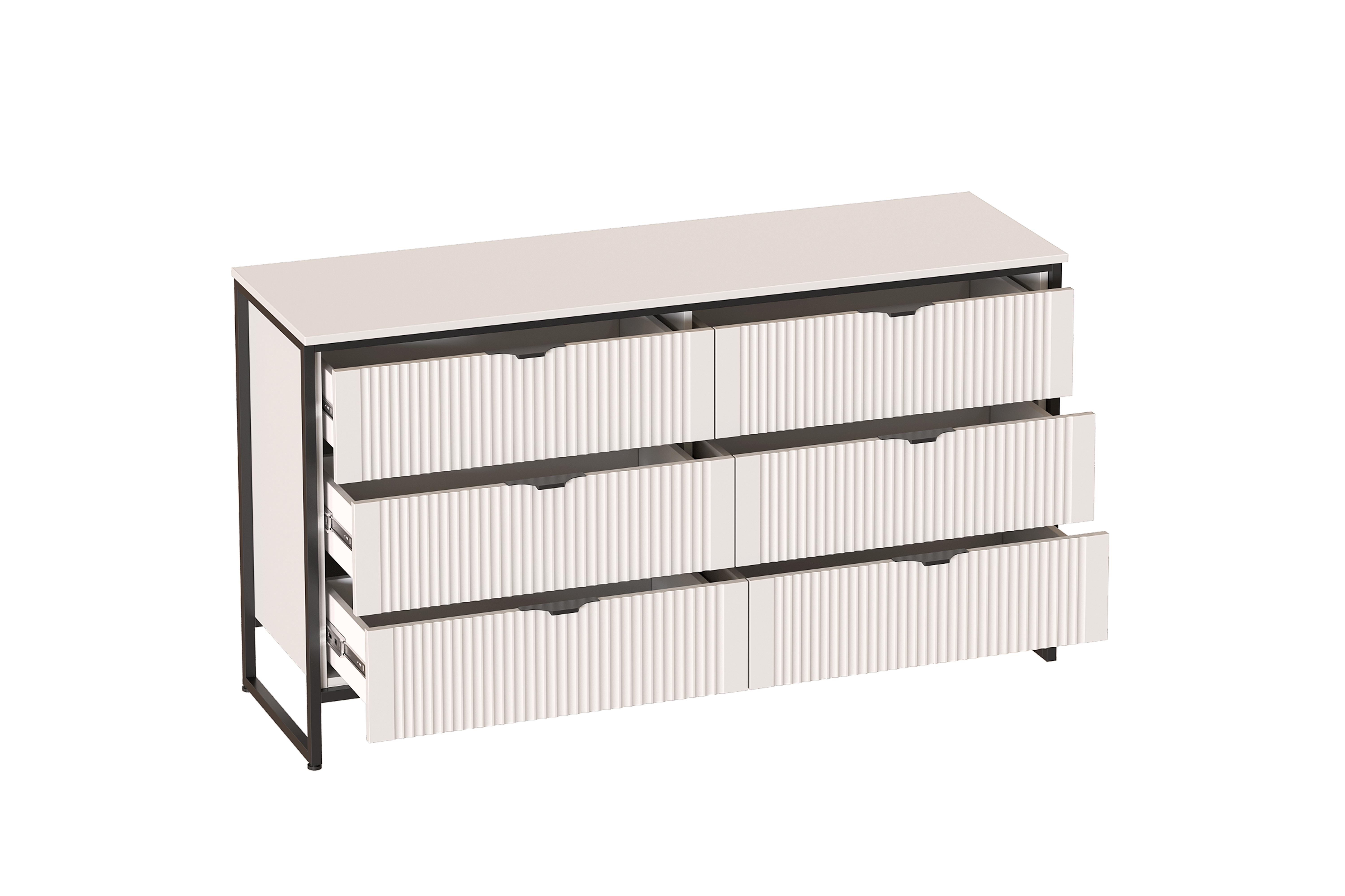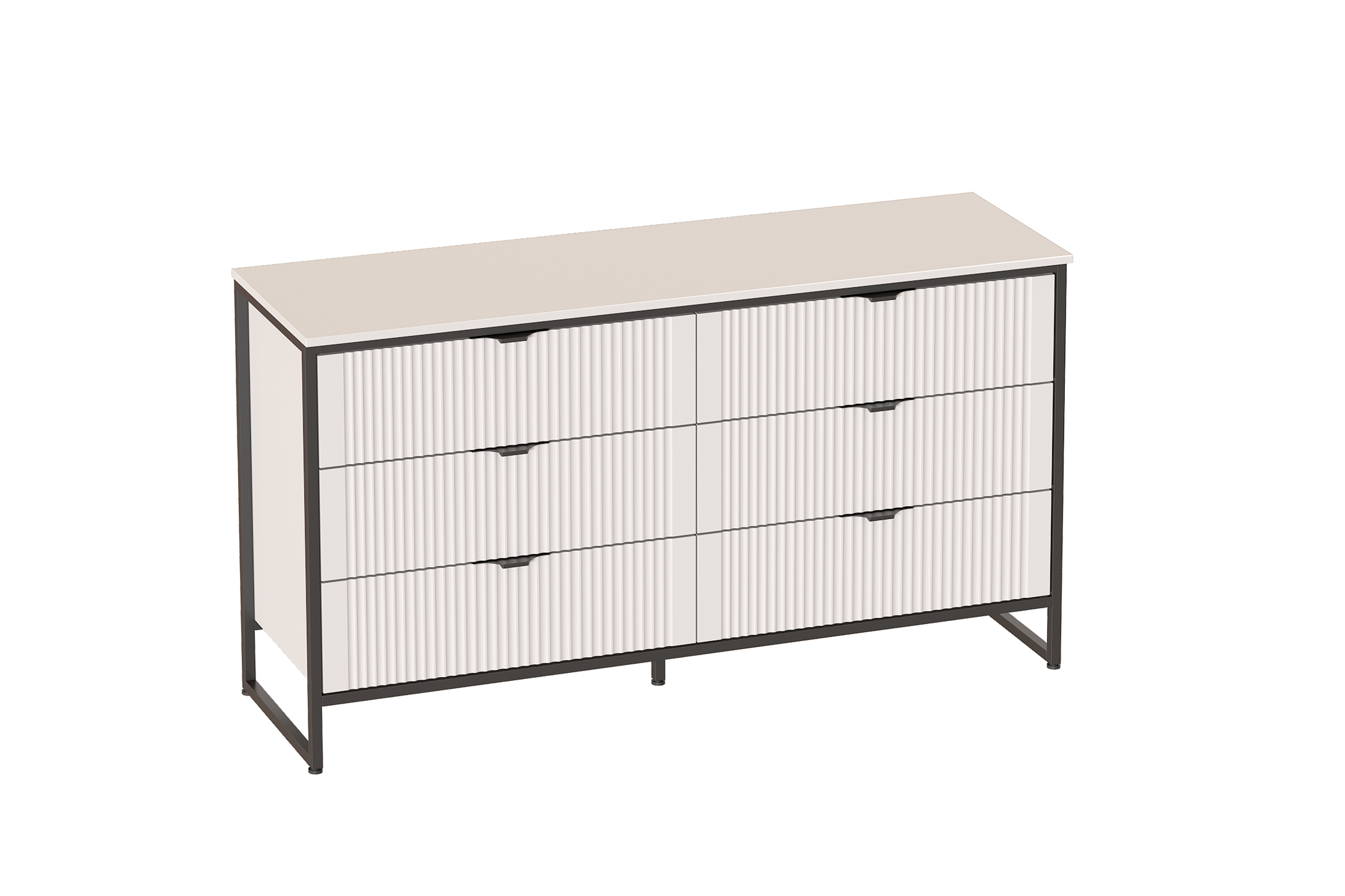 Комод "Нора" на металлокаркасе состоит из выдвижных ящиков, что позволяет удобно хранить вещи и поддерживать порядок в комнате. Внутреннее пространство разделено стенкой на два отделения, в каждом из которых установлены по три выдвижных ящика на шариковых направляющих с доводчиками. Он выполнен из безопасных, качественных материалов (лдсп и мдф), что гарантирует долговечность и сохранение первоначального вида на протяжении долгого времени.