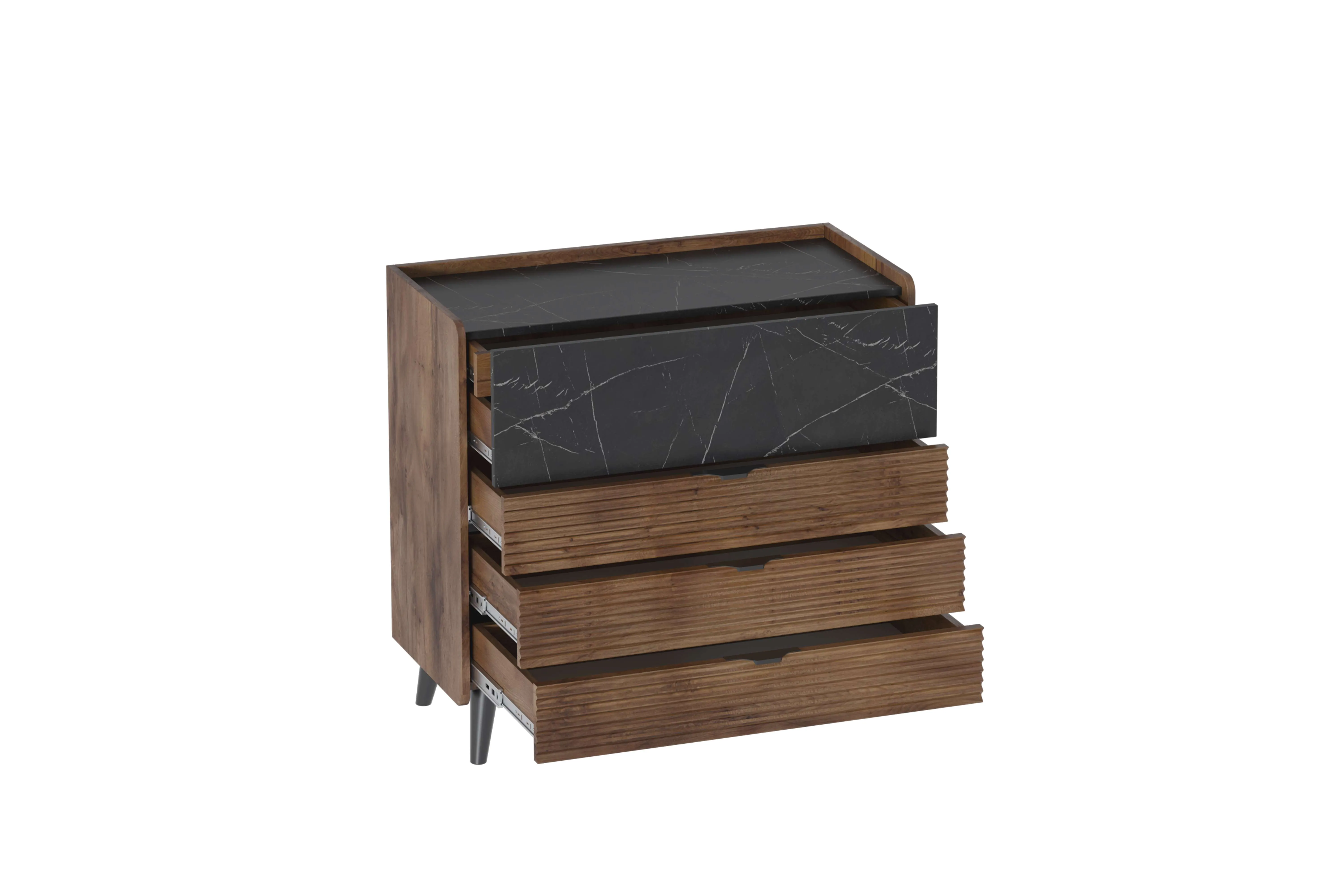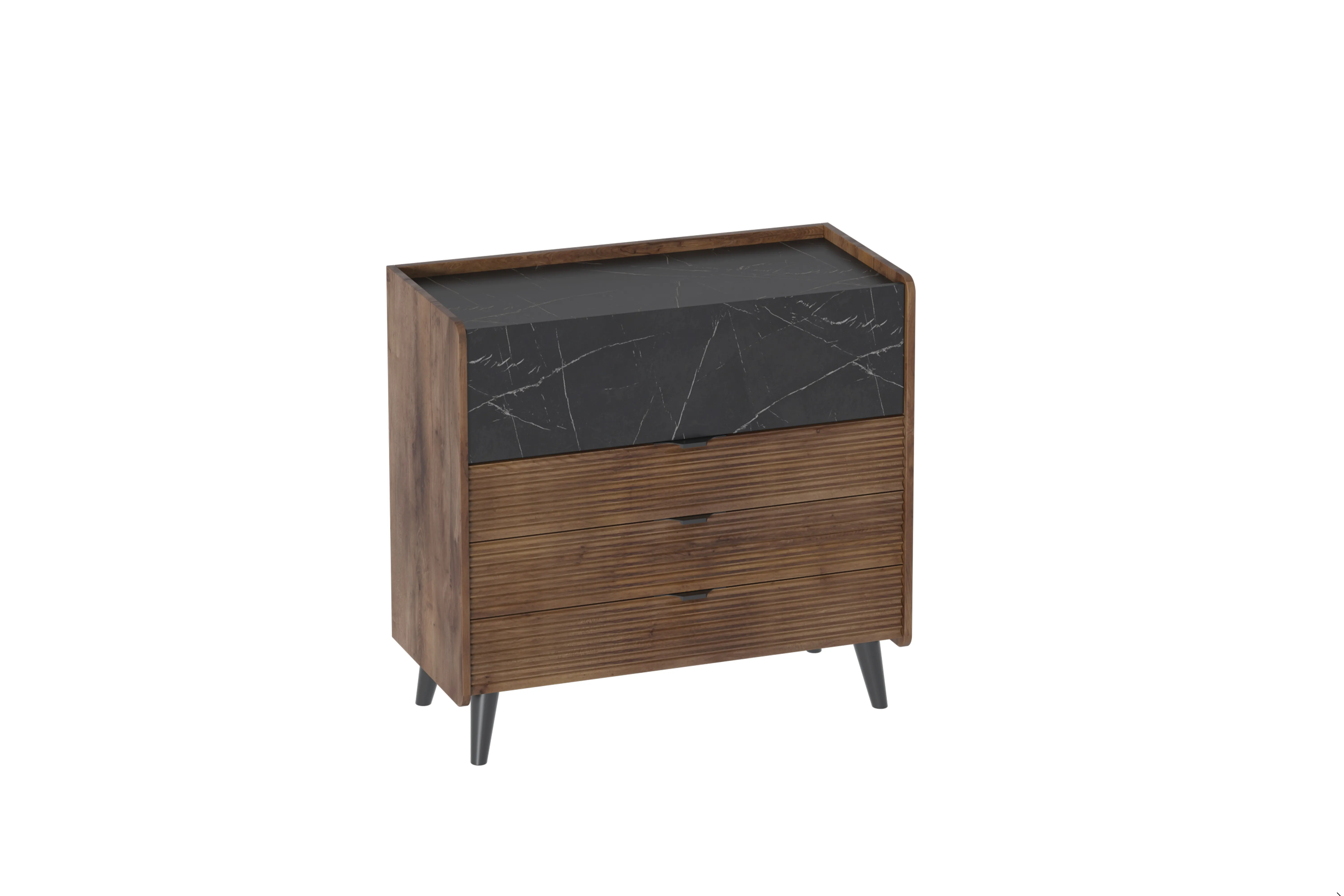 Привлекающий внимание легкостью и стильным оформлением, комод "Браун" не только украсит ваш дом, но и порадует своей функциональностью. Корпус комода и фасад большого ящика изготовлены из ЛДСП, декор на фасадах малых ящиков – из МДФ, стильные и устойчивые опоры - из массива березы.