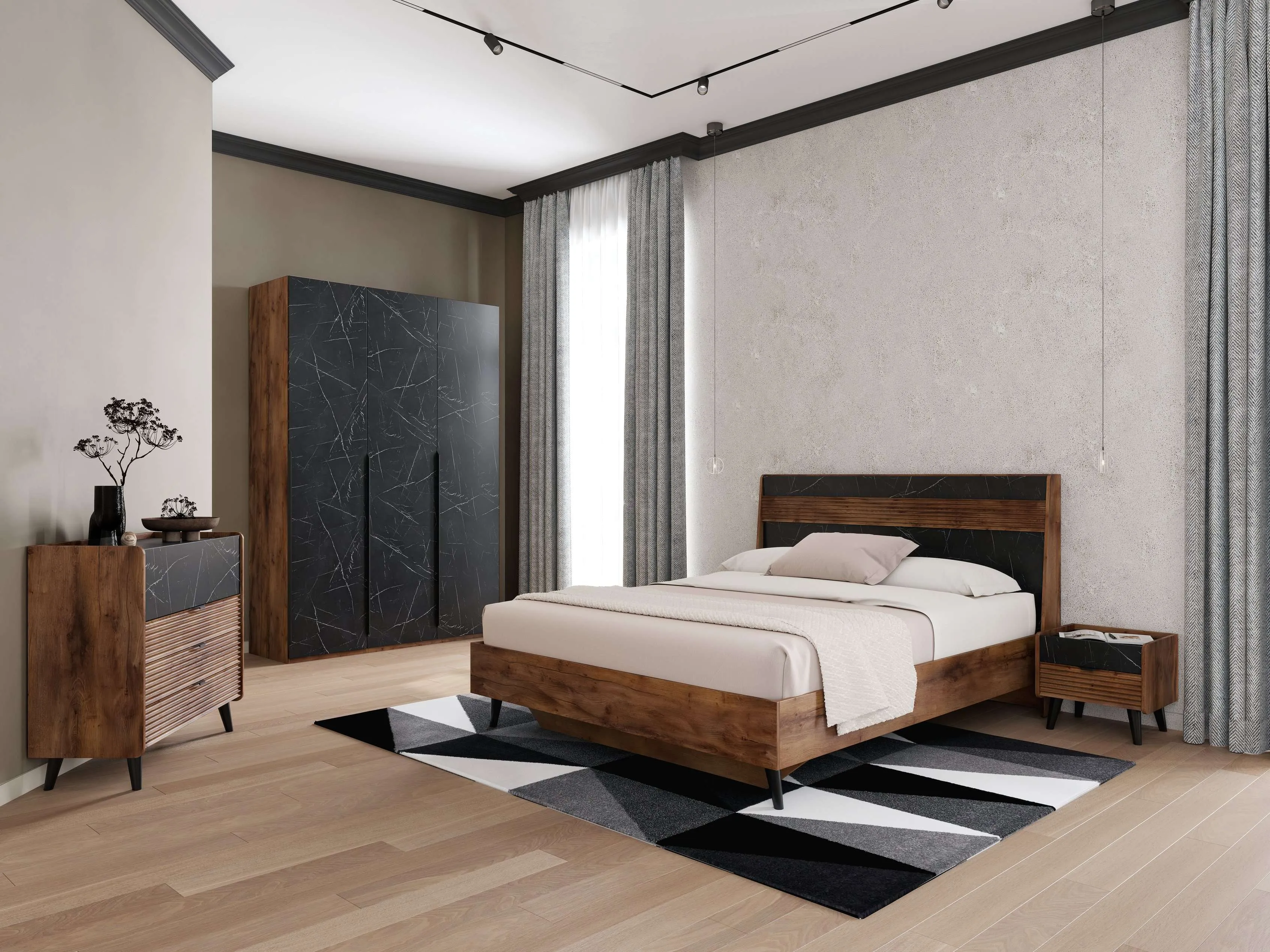 Серия мебели для спальни “Браун” в цвете Таксония/Мрамор неро маркина представляет собой элегантное и стильное решение для создания уютной атмосферы в вашей спальне. Мрамор придает мебели изысканный и роскошный вид, а Таксония добавляет теплые нотки и создает гармоничное сочетание с черным цветом.