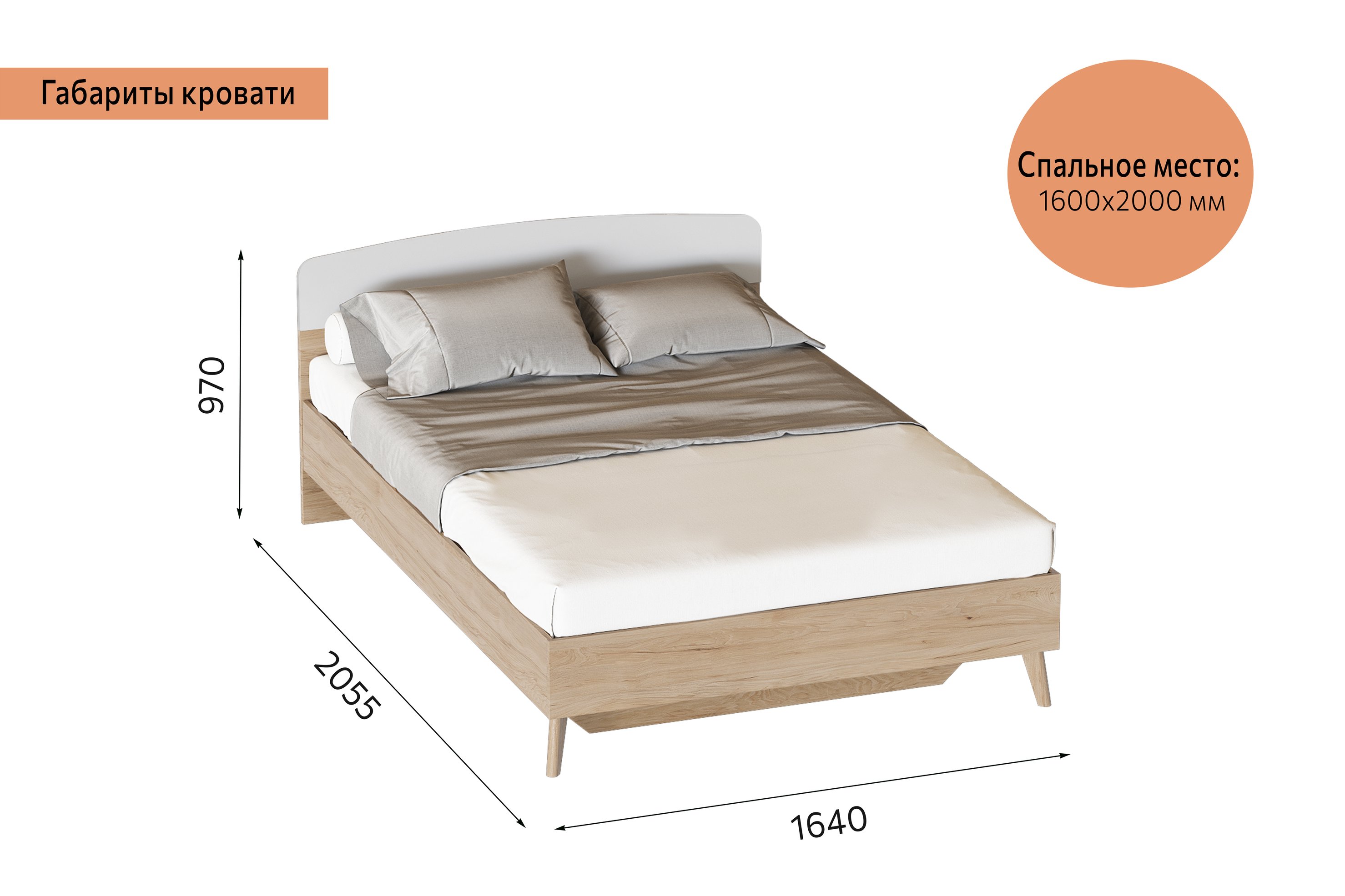 Корпус изготовлен из ЛДСП толщиной 16 мм в цвет натурального дуба, белая накладка в изголовье - из МДФ толщиной 16 мм. Опоры сделаны из натурального массива березы. Высота опор 25 см. Высота спального места 38 см. Рекомендуемая высота матраса 16-25 см. В комплект кровати входит прочное ортопедическое основание на березовых ламелях. Максимальная нагрузка на одно спальное место составляет 150 кг.