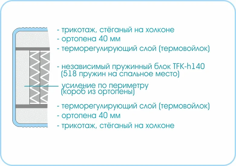 В составе комфортного слоя лежит увеличенный слой ортопены, который снимает нагрузку и поддерживает область поясницы. Сочетание наполнителя и независимых пружин обеспечивает глубокий и комфортный сон.
