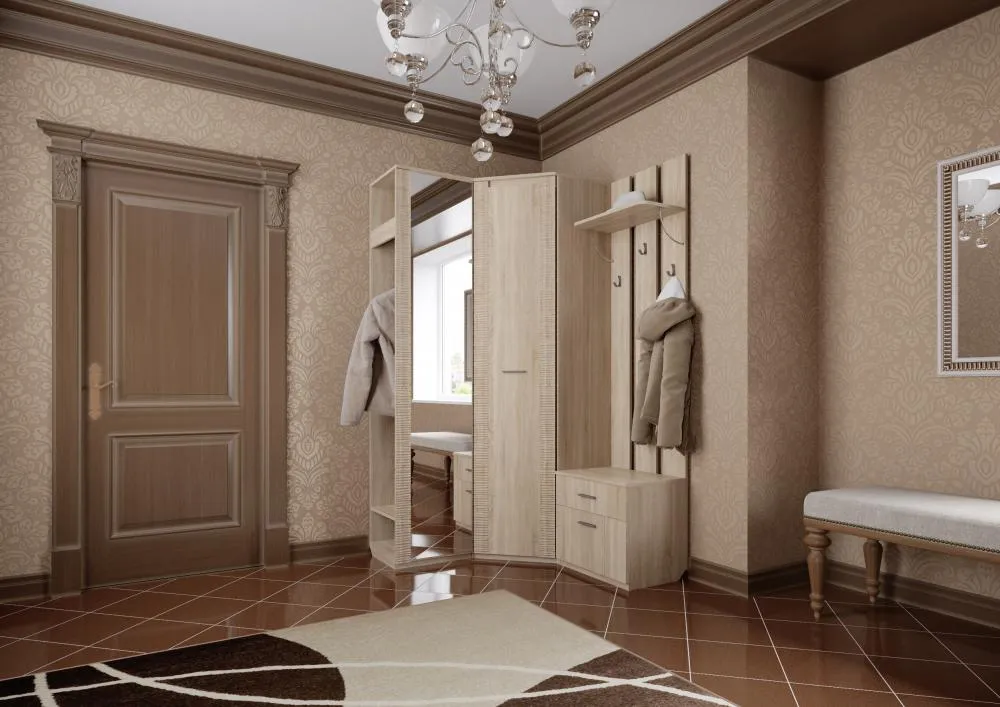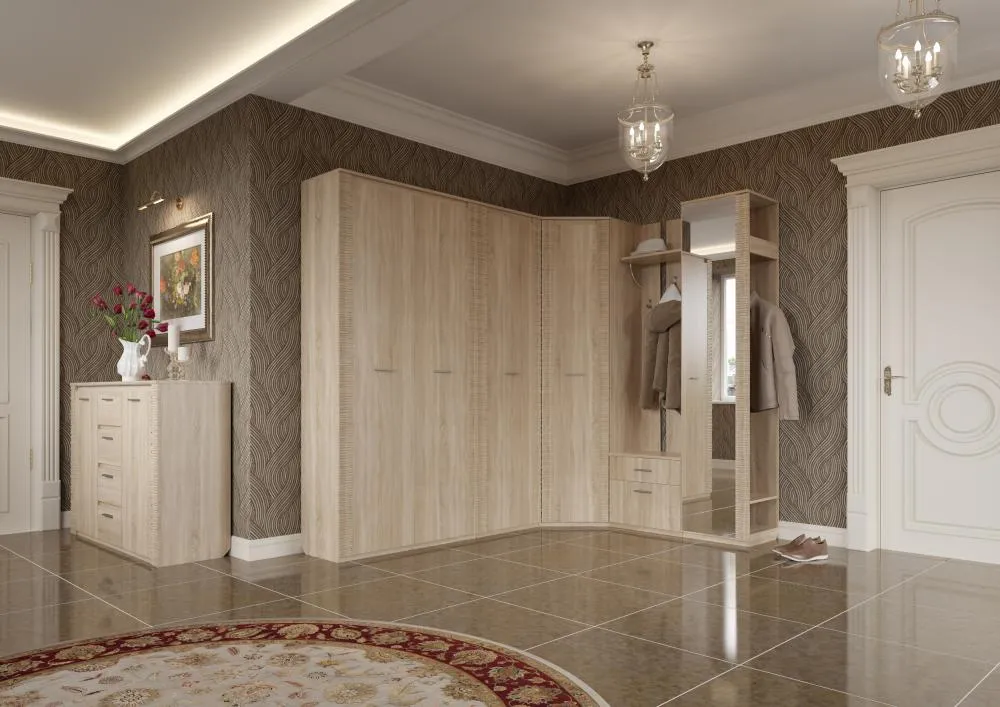 Создатели данной прихожей пошли на маленькую хитрость для экономии пространства: "Элана" имеет очень интересное угловое расположение. В закрытых и открытых шкафах, по всей длине одного из которых расположено зеркало, поместится необходимое количество одежды, обуви, головных уборов, сумок и других необходимых вещей и важных мелочей.