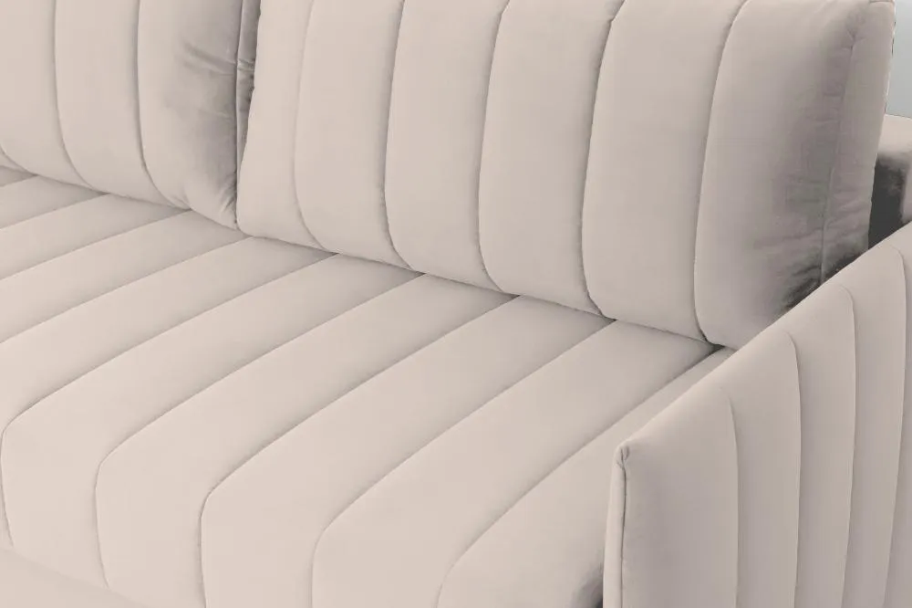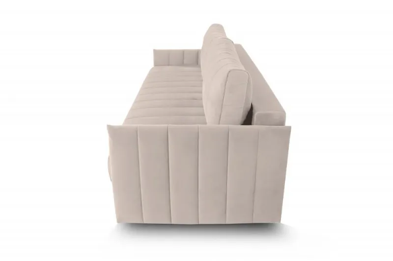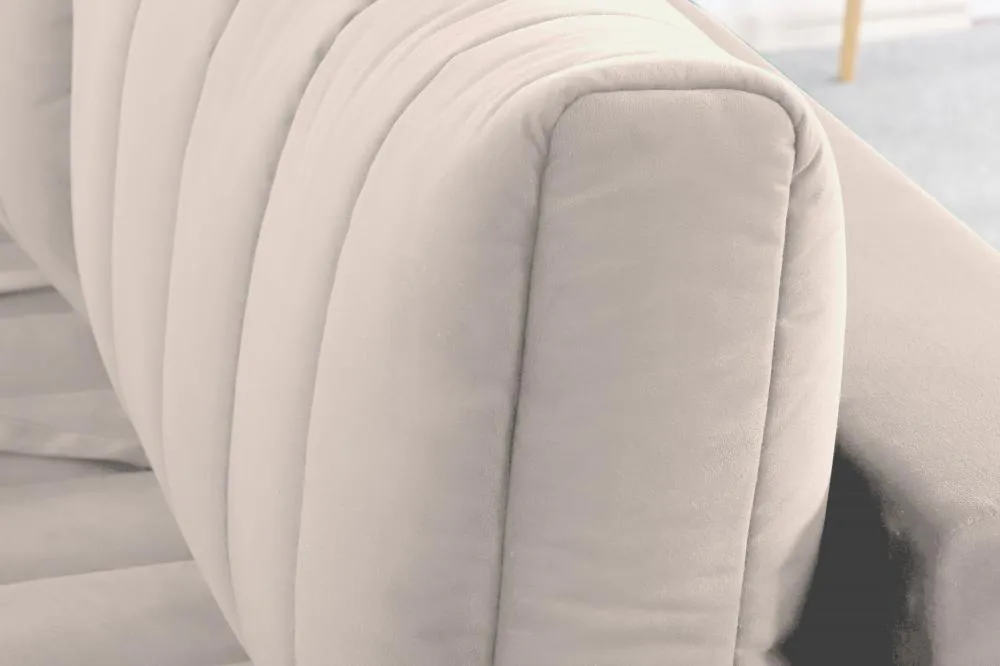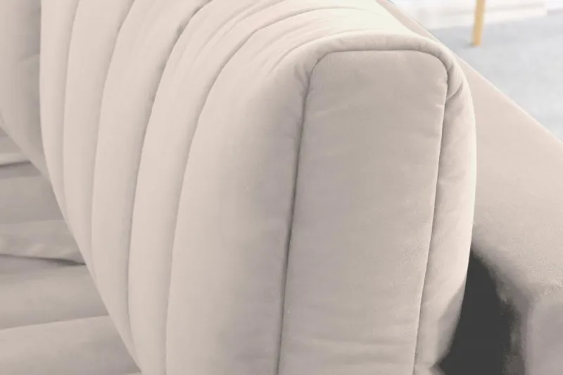 Подушки, сиденье и подлокотники дивана оформлены модной вертикальной стёжкой в современном стиле.