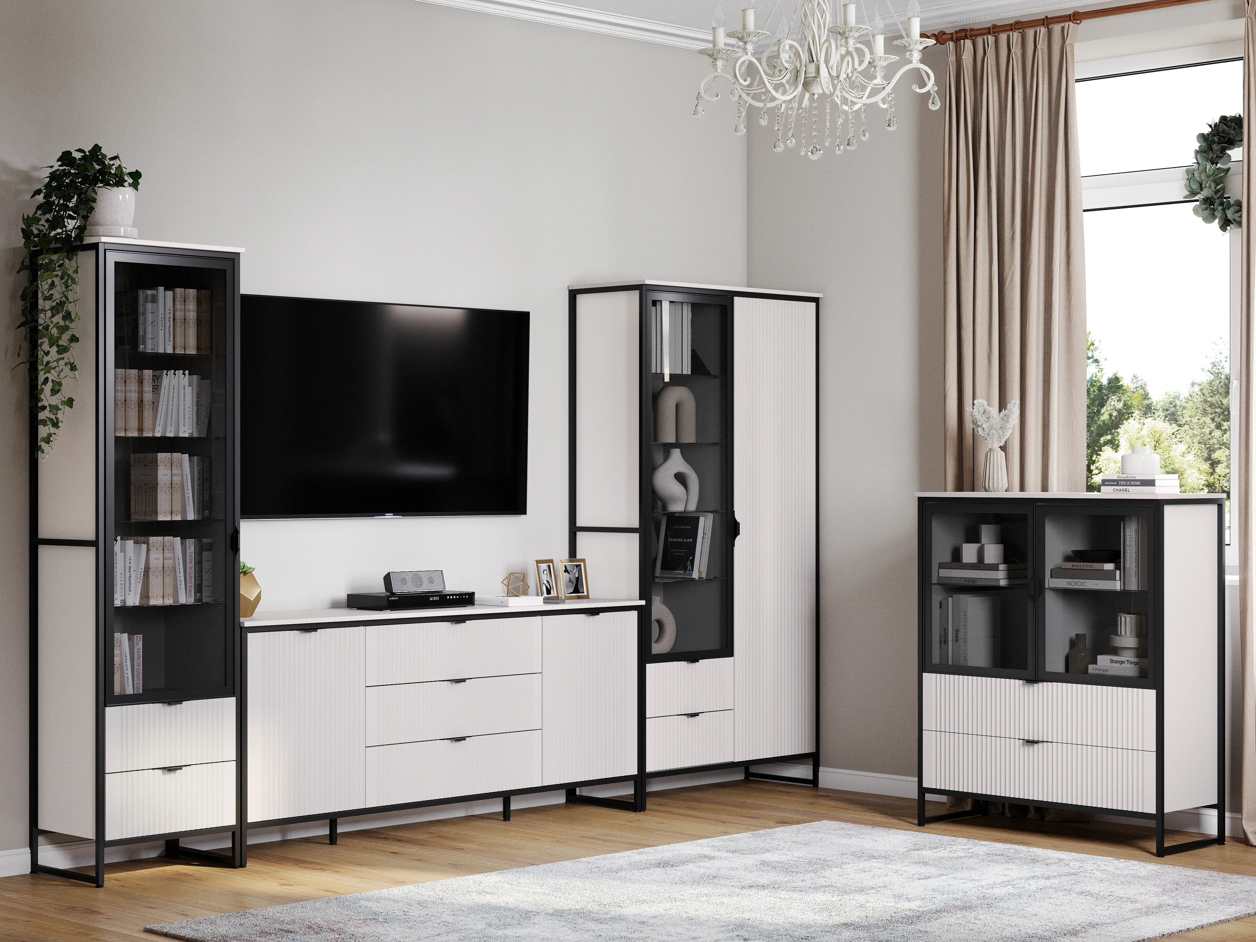 Коллекцию модульной гостиной "Нора" отличает современный оригинальный стиль. Декоративная продольная фрезеровка на фазадах из МДФ и опоры на металлокаркасе соответствуют модным тенденциям этого года в ведущих зарубежных коллекциях.