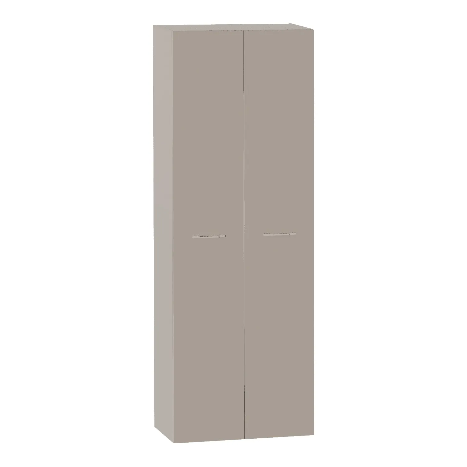Шкаф двухдверный выполнен из ЛДСП цвета Капучино и имеет 2 вместительных полки в верхней части шкафа, 4 полки в правой части, и штангу для одежды на плечиках - в левой. Ручки в форме скобы выполнены из белого матового металла. Все петли - плавного закрывания.