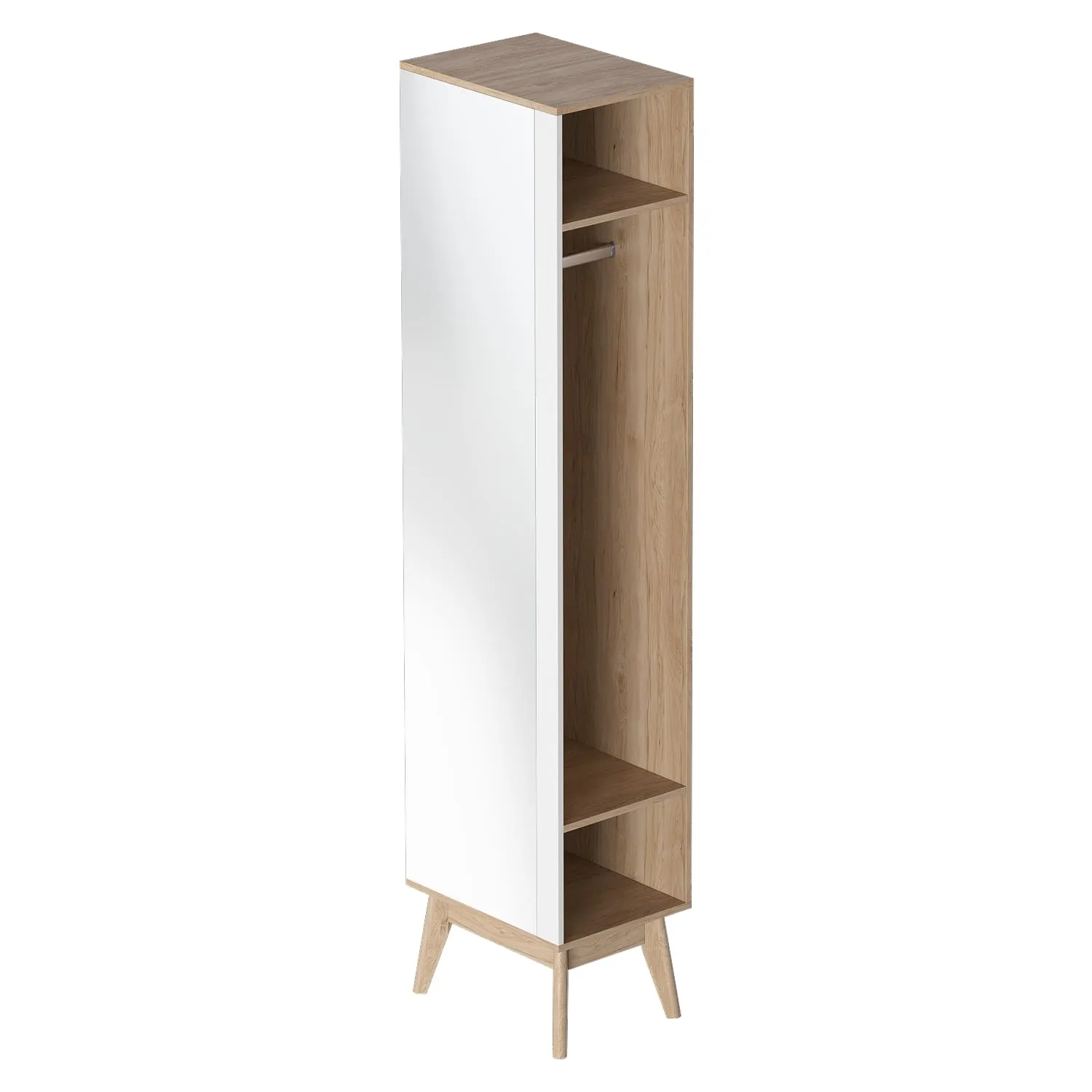 Справа от зеркала, фасад украшен белоснежной планкой из МДФ. Корпус шкафа выполнен из ЛДСП цвета натурального дерева, высокие стильные опоры - из массива березы. Шкаф идеально сочетается с шкафом "Калгари" двухстворчатым для прихожей, всеми комодами "Калгари", а также тумбой для прихожей "Калгари" с двумя ящиками и с вешалкой "Калгари".