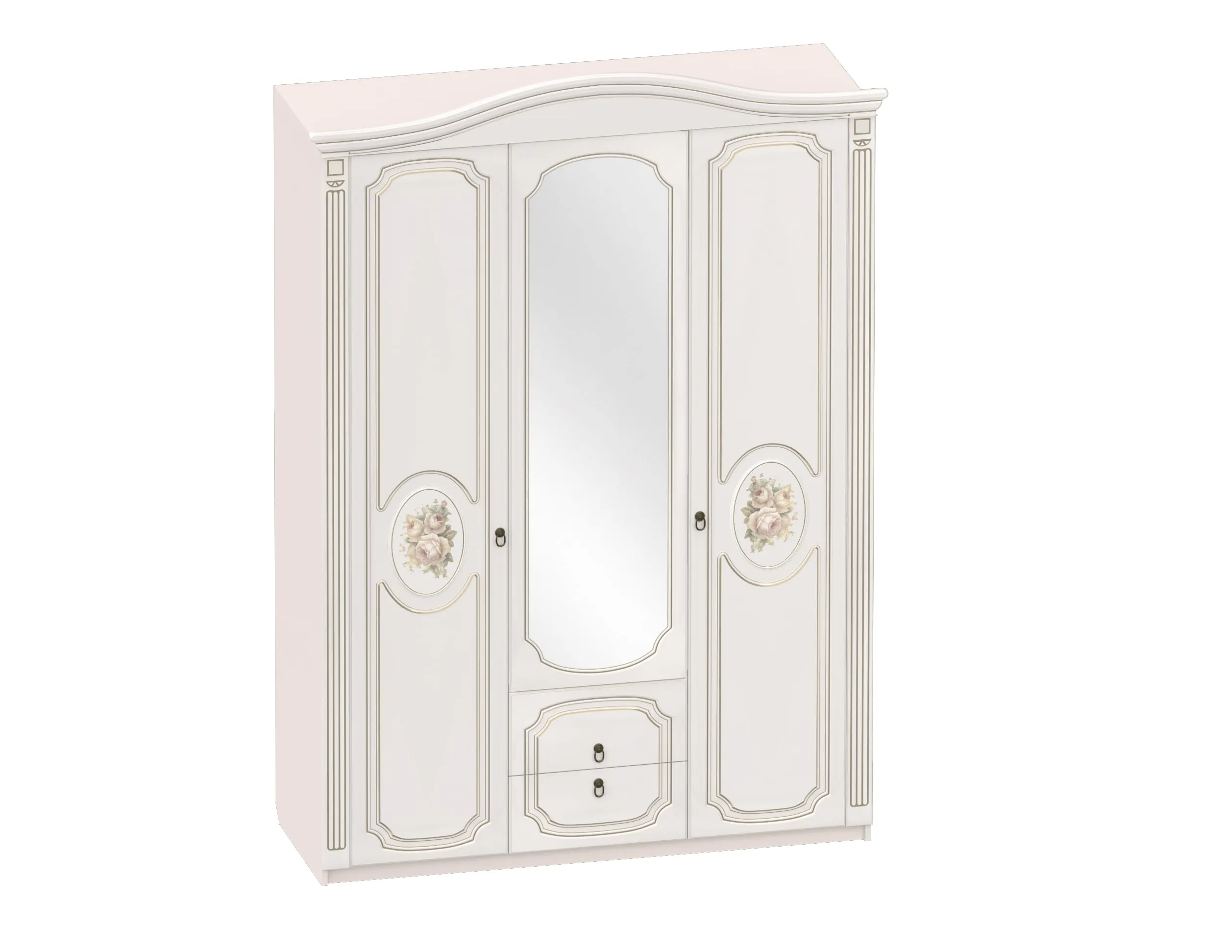 Фасады мебели декорированы элегантной фрезеровкой с эффектом патины и медальоном, на котором изображены розы. Для удобства использования дверцы и ящики оснащены темными металлическими ручками, имитирующими ковку.