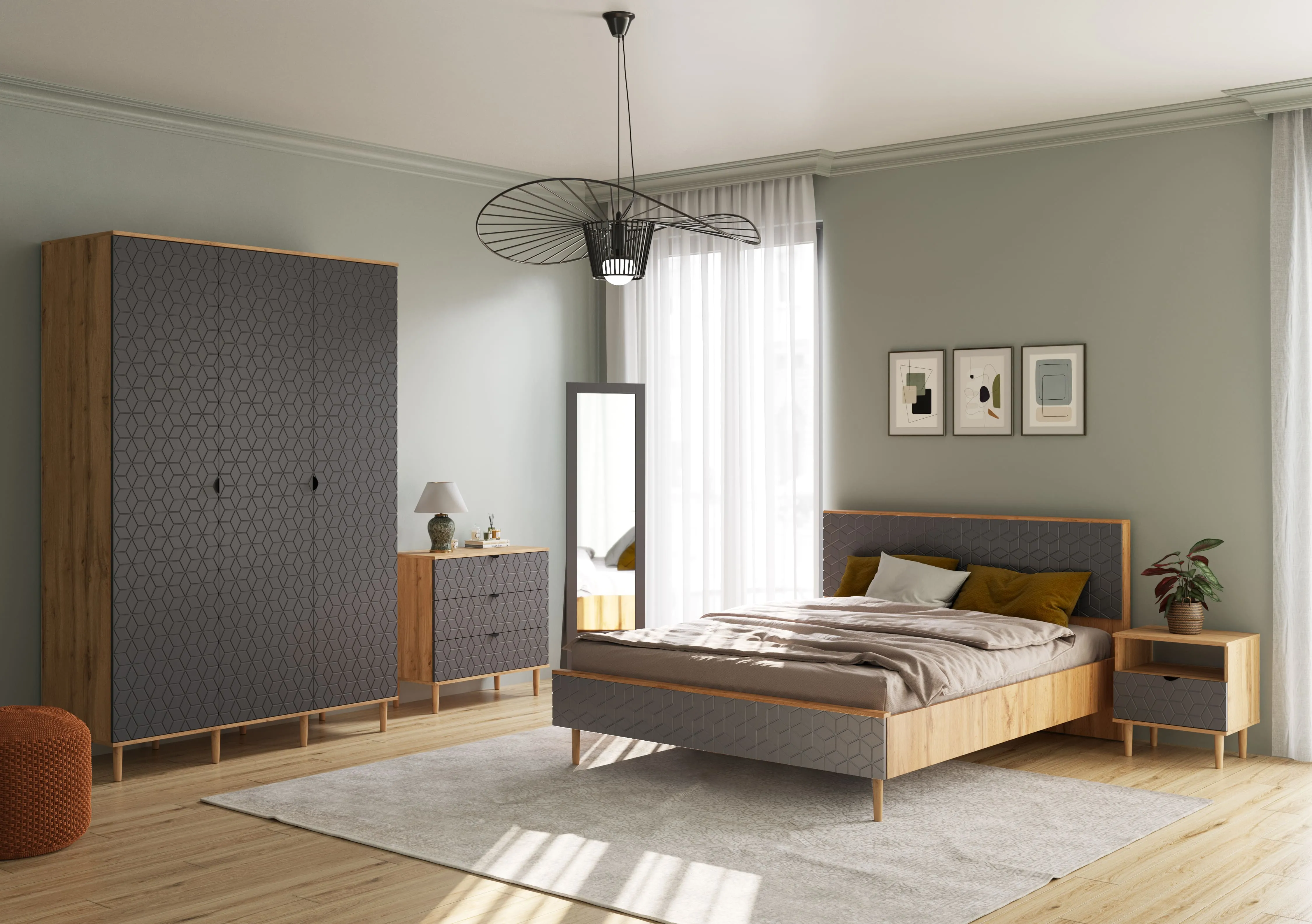 Спальный гарнитур “Денвер” выполнен в шикарном цветовом сочетании “Дуб вотан/Графит”, который привнесет в Ваш дом ощущение стиля, тепла и спокойствия.
