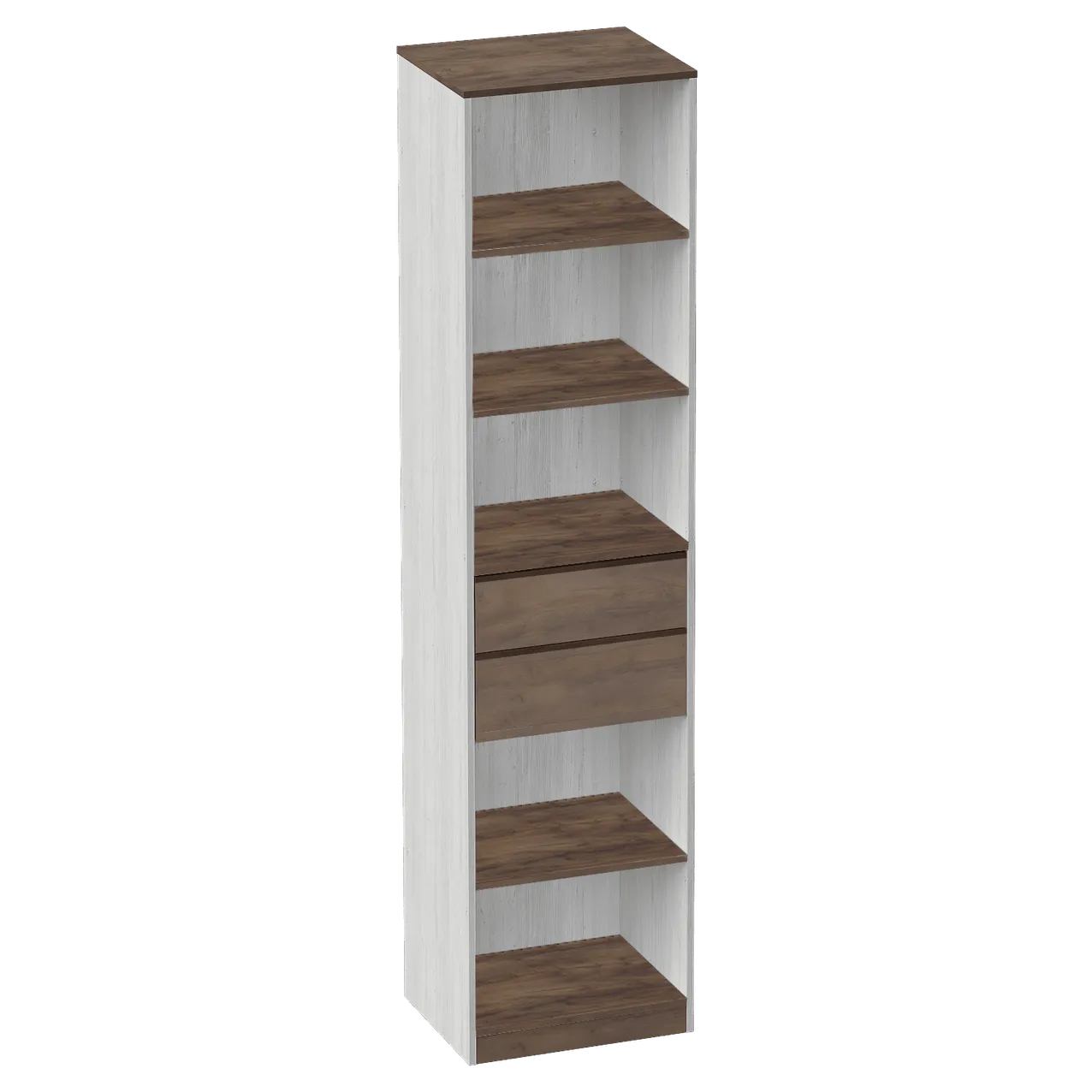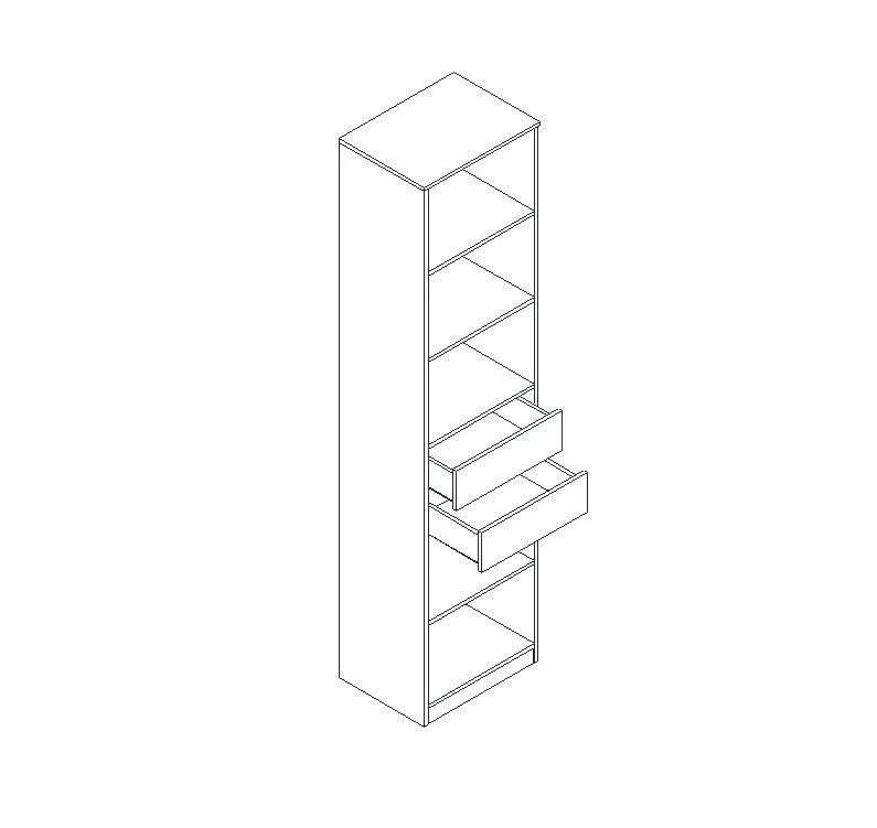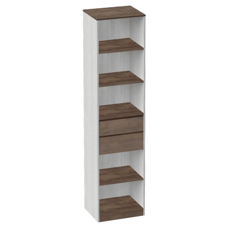 Стеллаж имеет пять открытых полок и два выдвижных ящика на шариковых направляющих, где вы можете разместить книги, аксессуары и другие предметы декора.