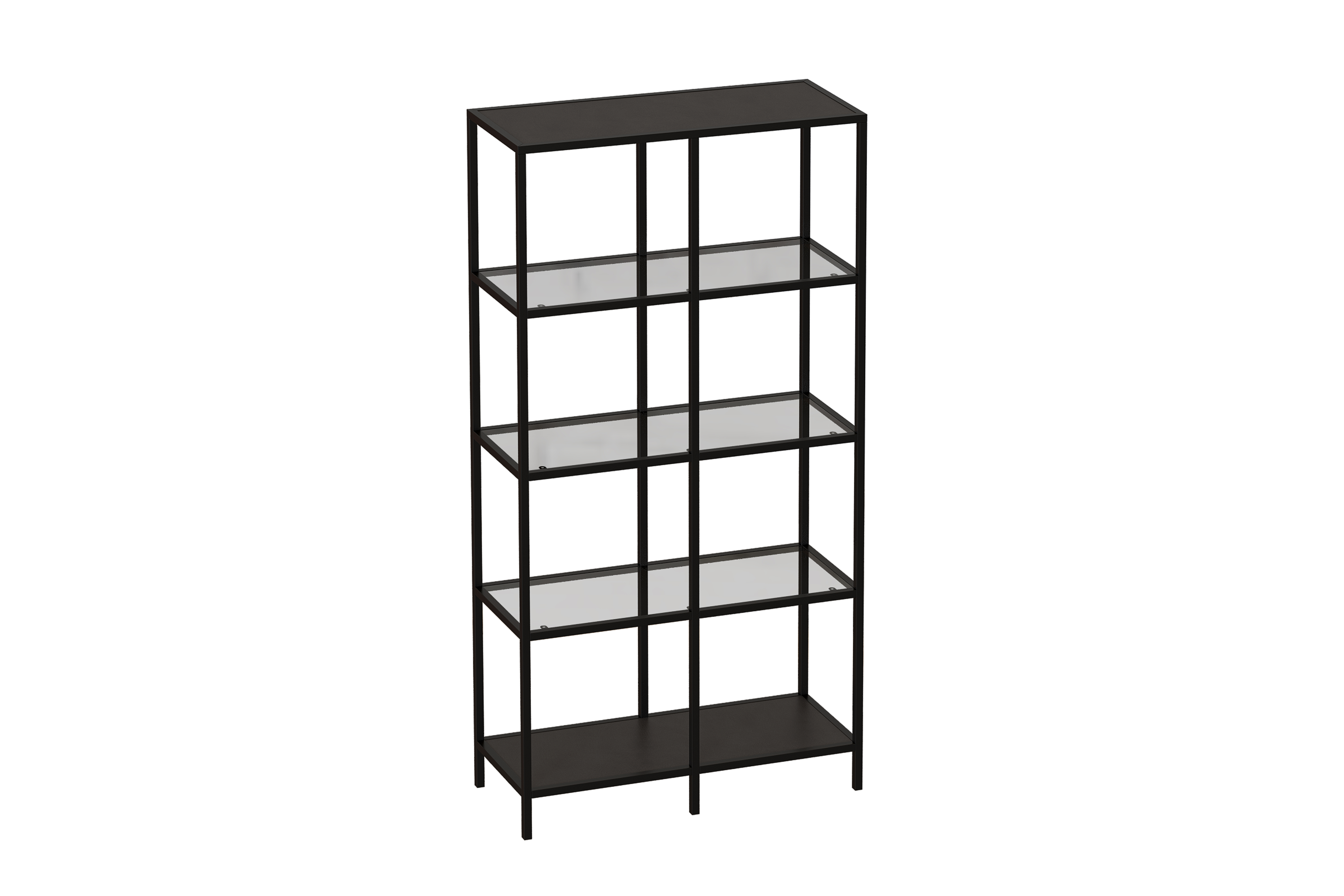 Стеллаж со стеклянными полками "Нора". Опорой для стеллажа служит черный металлокаркас. Верхняя и нижние полки металлические. Средние выполнены из прозрачного стекла толщиной 5 мм. Опоры регулируются по высоте. Предусмотрены отверстия для фиксации к стене.