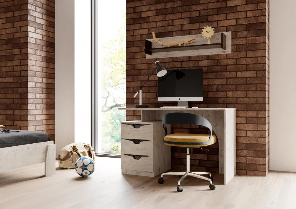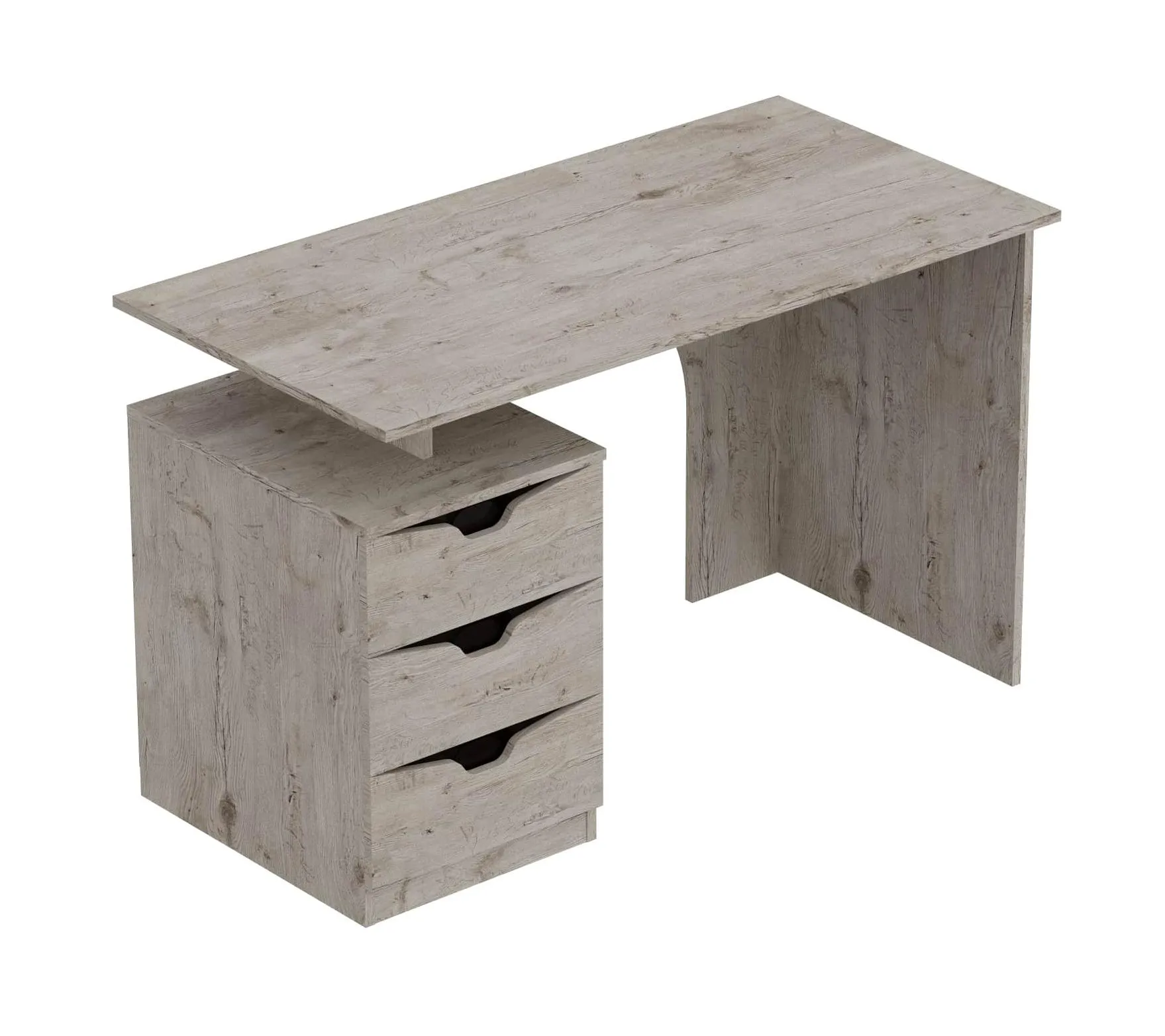 Стол изготовлен из качественных, безопасных материалов, что гарантирует его надежность и долговечность. Он оснащен тумбой с тремя ящиками, которые идеально подходят для хранения документов и канцелярских принадлежностей. Также на столе есть место для монитора компьютера и клавиатуры. На фасаде имеются декоративные вырезы, выполняющие функцию ручек.