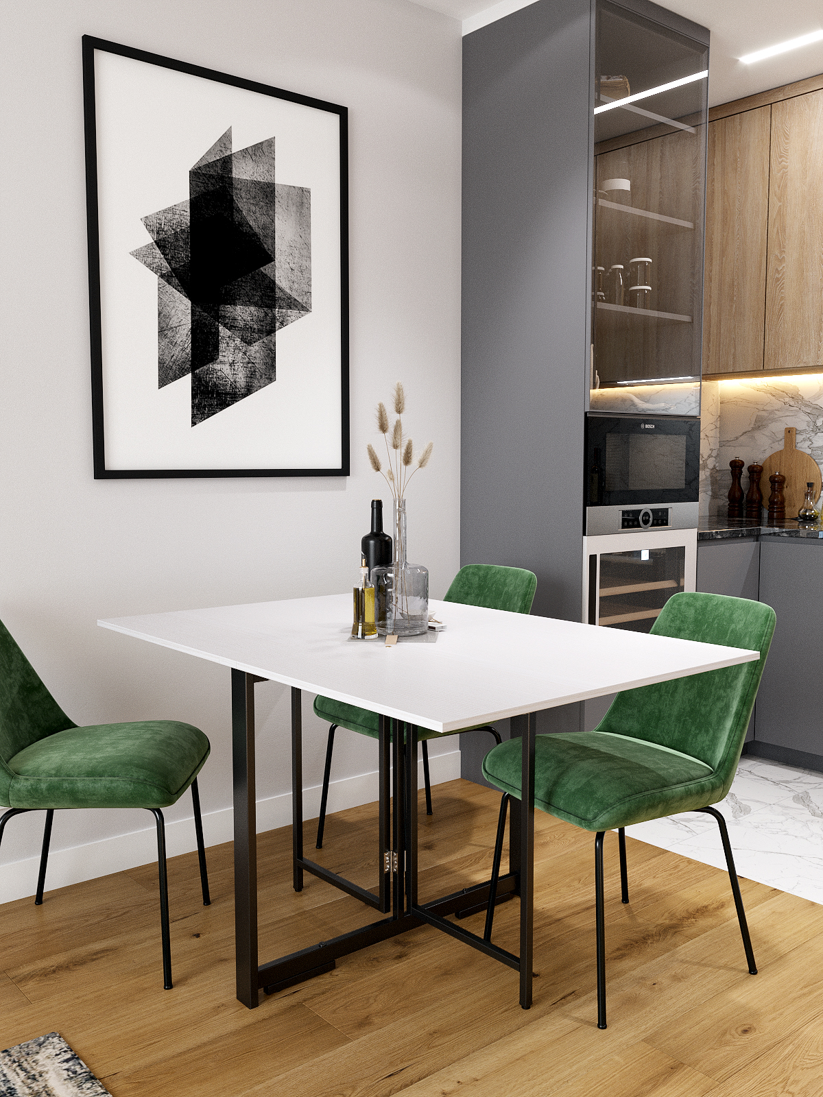Раскладной стол "Брион 2" со столешницей из ЛДСП. Опорой для столешницы служит металлокаркас. В конструкции изделия предусмотрены регулируемые по высоте опоры.