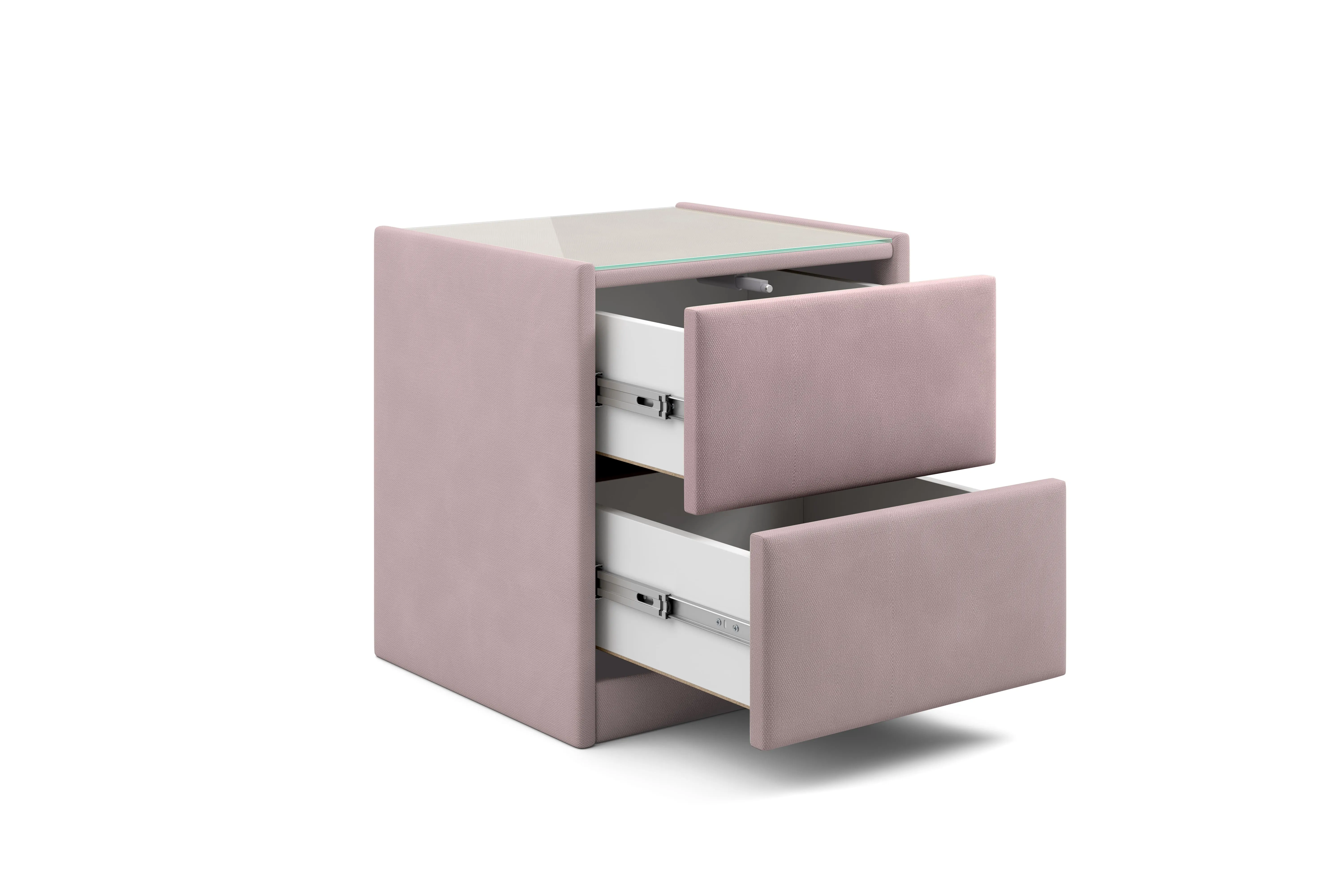 Тумба обтянута высококачественным велюром, что придает ей особый уют и комфорт. Имеет стеклянную столешницу и два вместительных выдвижных ящика с механизмом Push to open. Скругленные торцы модели, минимизируют риск удариться в темноте.