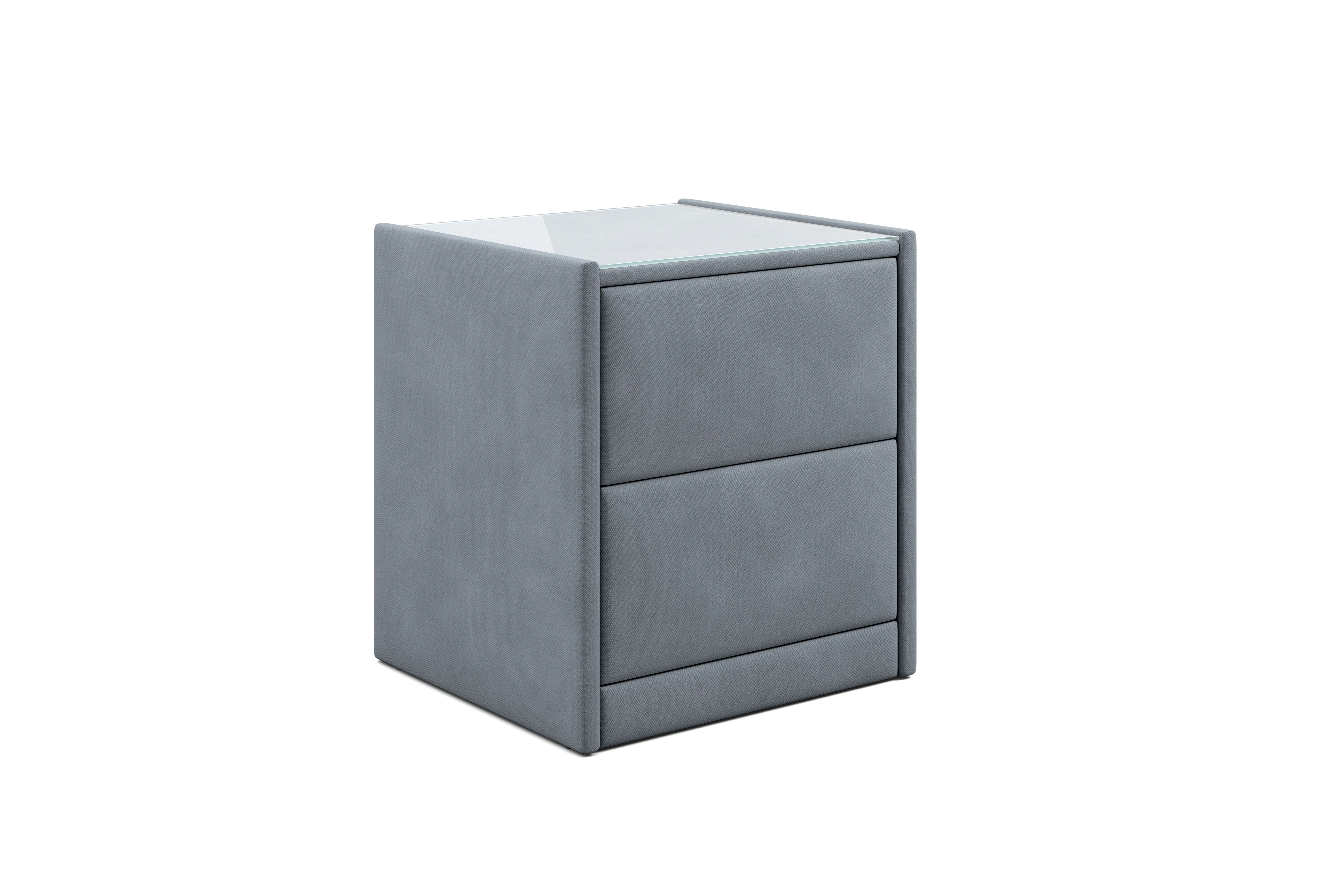 Тумба обтянута высококачественным велюром, что придает ей особый уют и комфорт. Имеет стеклянную столешницу и два вместительных выдвижных ящика с механизмом Push to open. Скругленные торцы модели, минимизируют риск удариться в темноте.